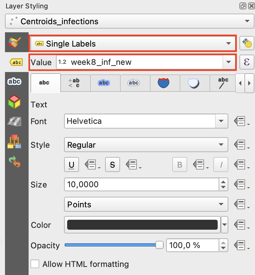 Layer Styling Panel, select your centroid layerCentroids_infectionsand select Labels in the side bar on the left hand sideIn the labels panel select “Single labels” in the drop down menue.
