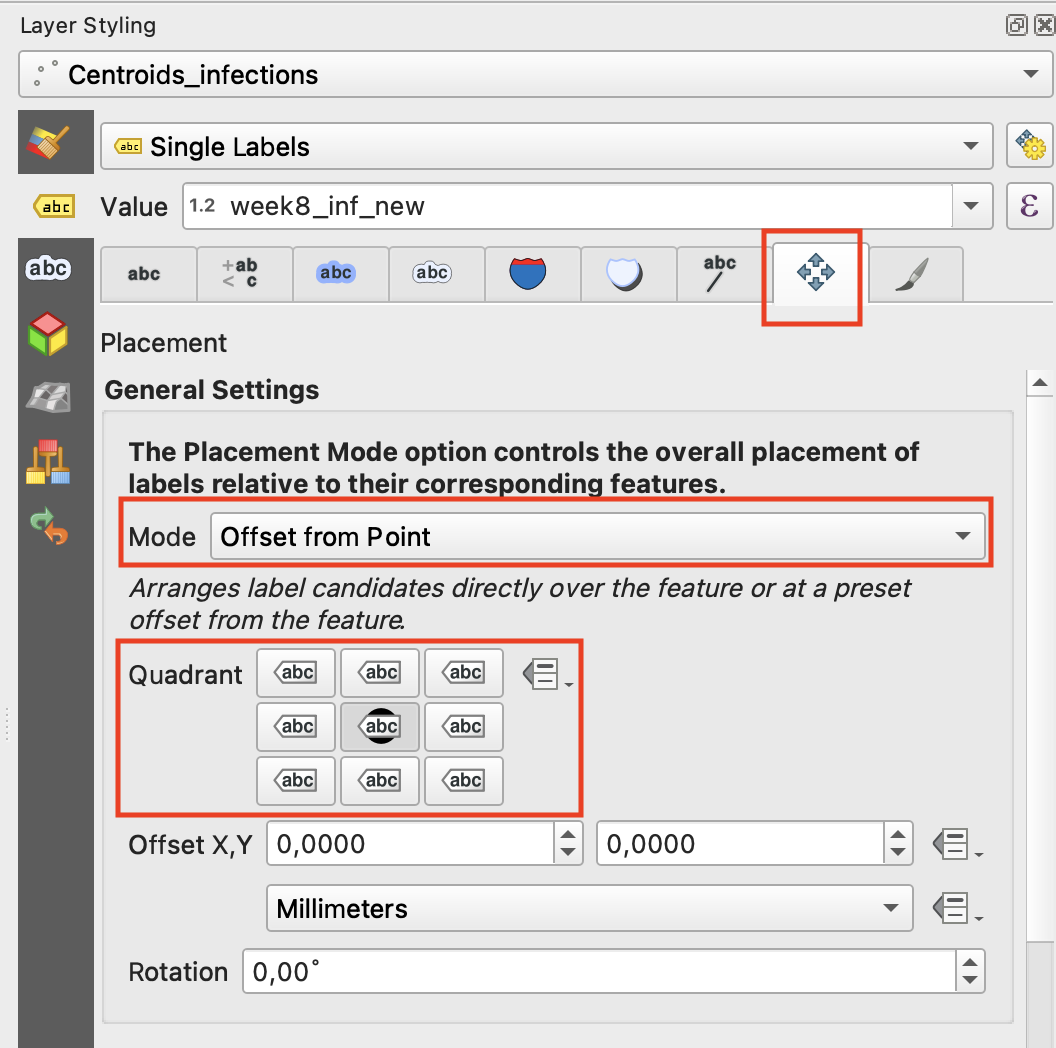 To optimize the location of the point labels navigate to the “Placement” panel and for “Mode” select “Offset from Point”. With the “Quadrant” option you can determine the placement of the labels relative to the the centroid to you liking