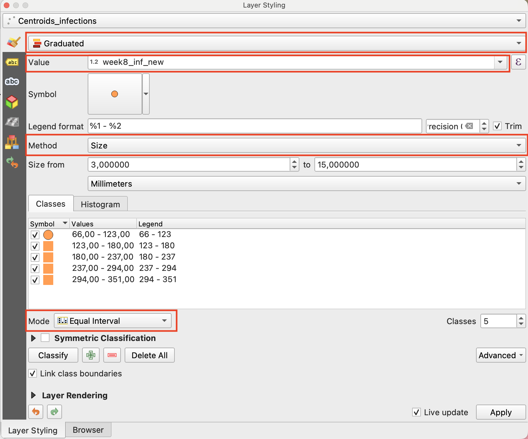 Layer Styling Panelselect your centroid layerCentroids_infectionsand make sure the Symbology menue is selected.At the top of the Symbology window, change the style from Single Symbol to Graduated