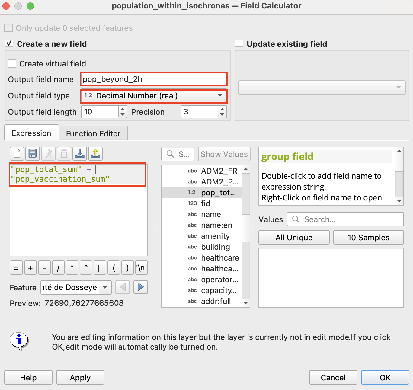 population_within_isochronesdata we need to join it back onto the original admin 2 boundaries to have the original geometry. Open the Join attributes by field value tool:Input layer: