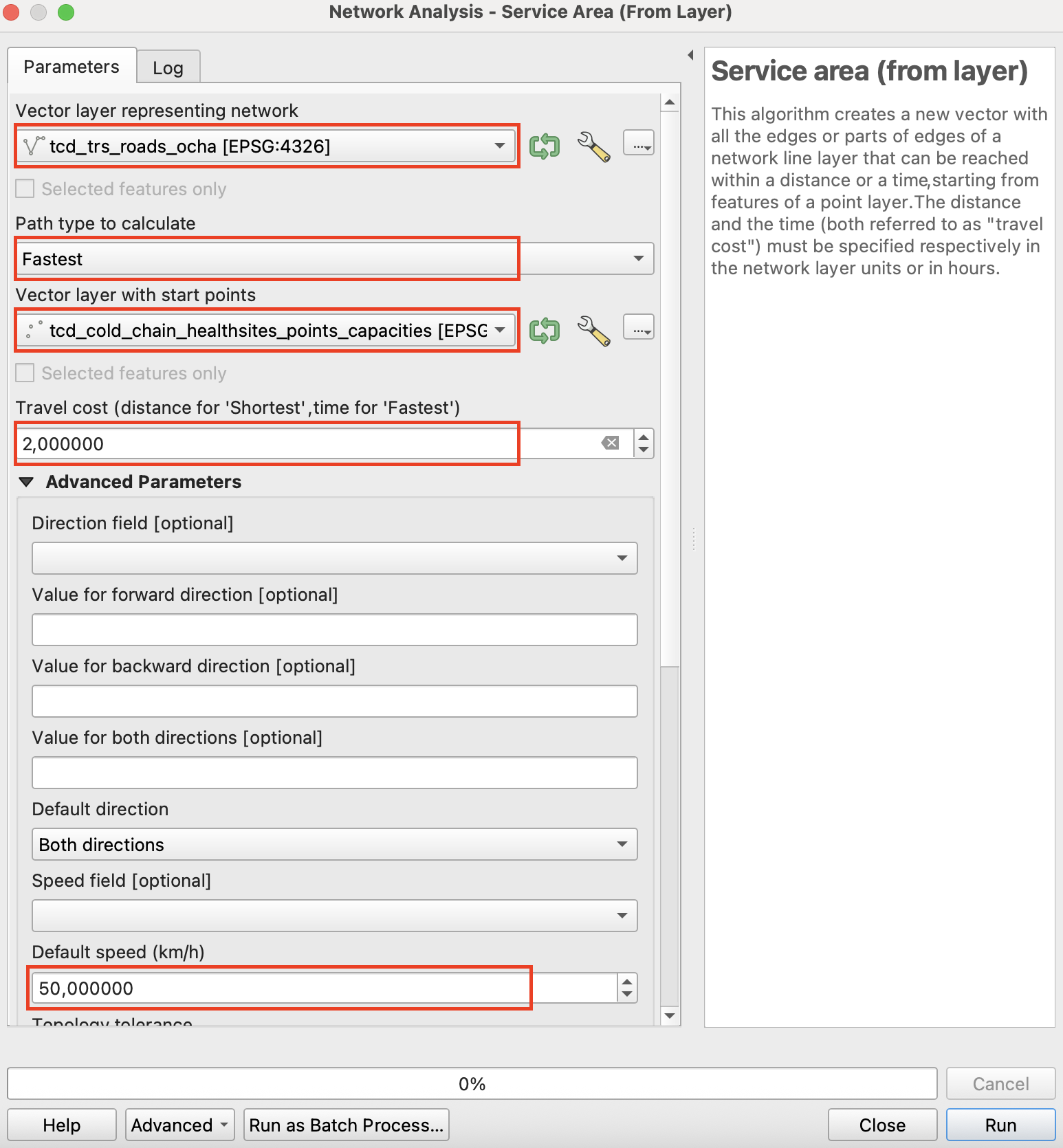 Open the âService area (from layer)â tool in the Processing Toolbox.