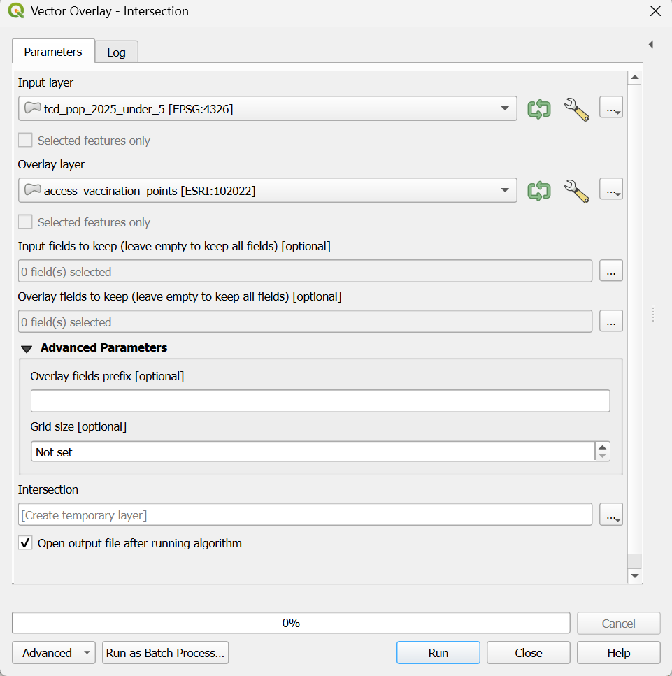 adm2_access_vaccination_pointsThen run the algorithm. The output will be the access-to-vaccination geometry with the district information added. In other words, the single access area is split into multiple parts where it intersects district boundaries, assigning each portion to the corresponding district.