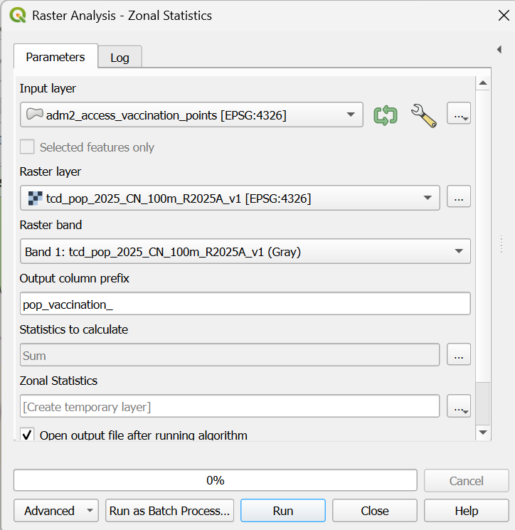To do this, you will generate travel-time surfaces around vaccination points and then use WorldPop data to estimate the population covered within each accessibility zone. This approach simplifies reality but provides a useful approximation of service coverage.