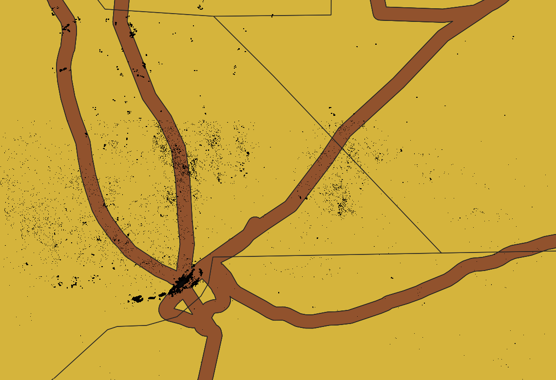 Both the Dissolve and Buffer operations can be computationally intensive. If your computer struggles to process the full dataset at once, try running the operations on smaller areasâfor example, a few admin 1 states at a time. To do this, select several states from the tcd_admin1 layer, then right-click the layer â Export â Save Selected Features As⊠and save the subset. Use the Clip tool to cut the service-area roads to this smaller region, and then run the Dissolve and Buffer operations on the reduced dataset.