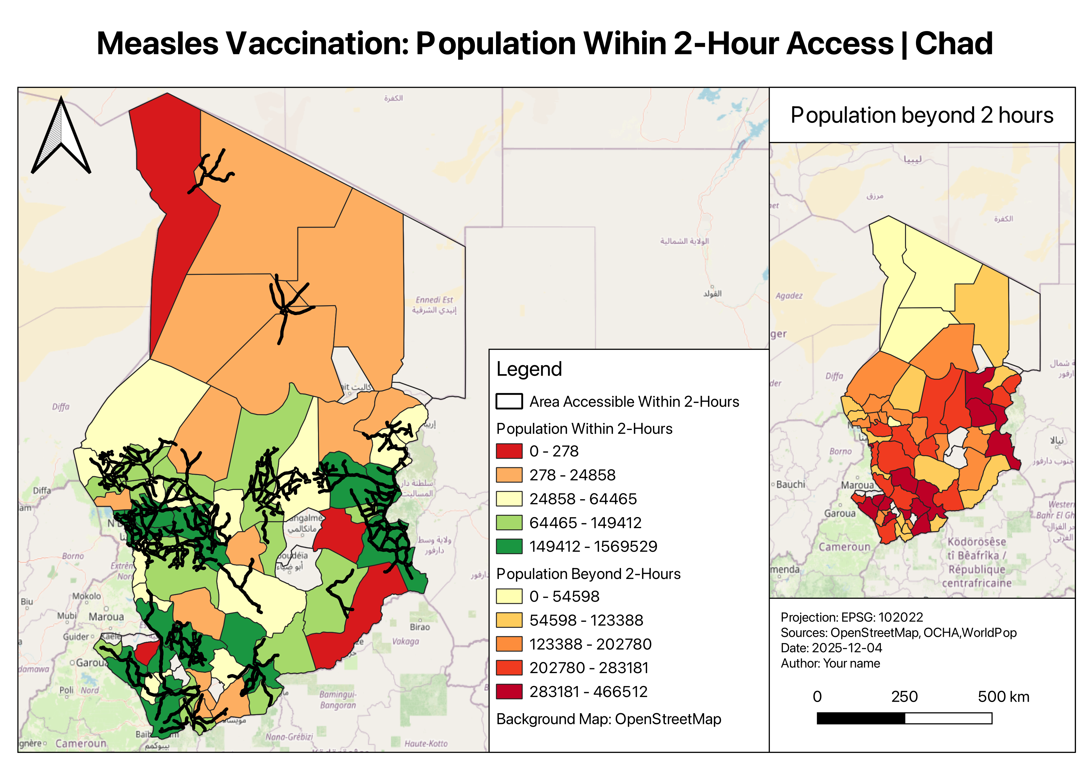 Example map for Measles Vaccination: Population Wihin 2-Hour Access | Chad#
