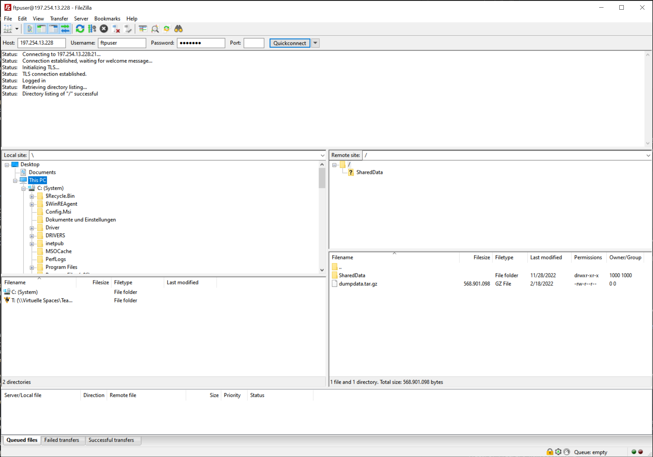 In FileZilla you have four windows. On the left hand side you will see the folder on your computer in the upper window. By clicking on a folder, the documents in the folder will be shown in the lower left window. On the right hand side, you will see in the upper window the FTP data folder and by clicking on it, the data will be shown in the lower right window.