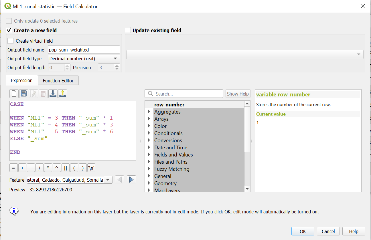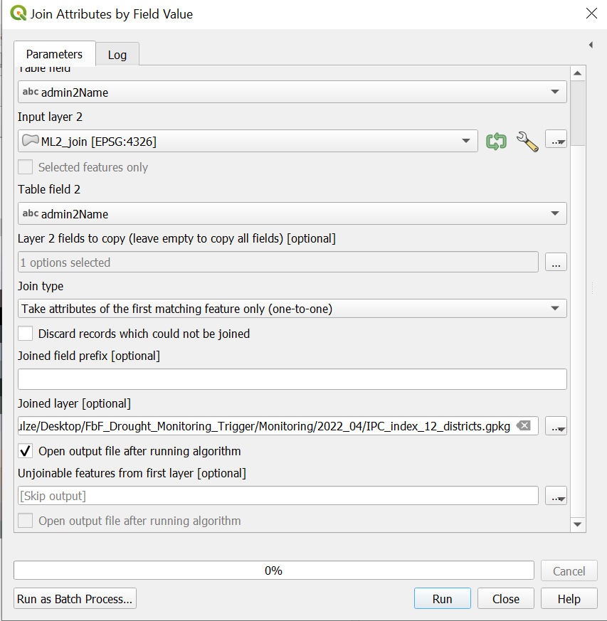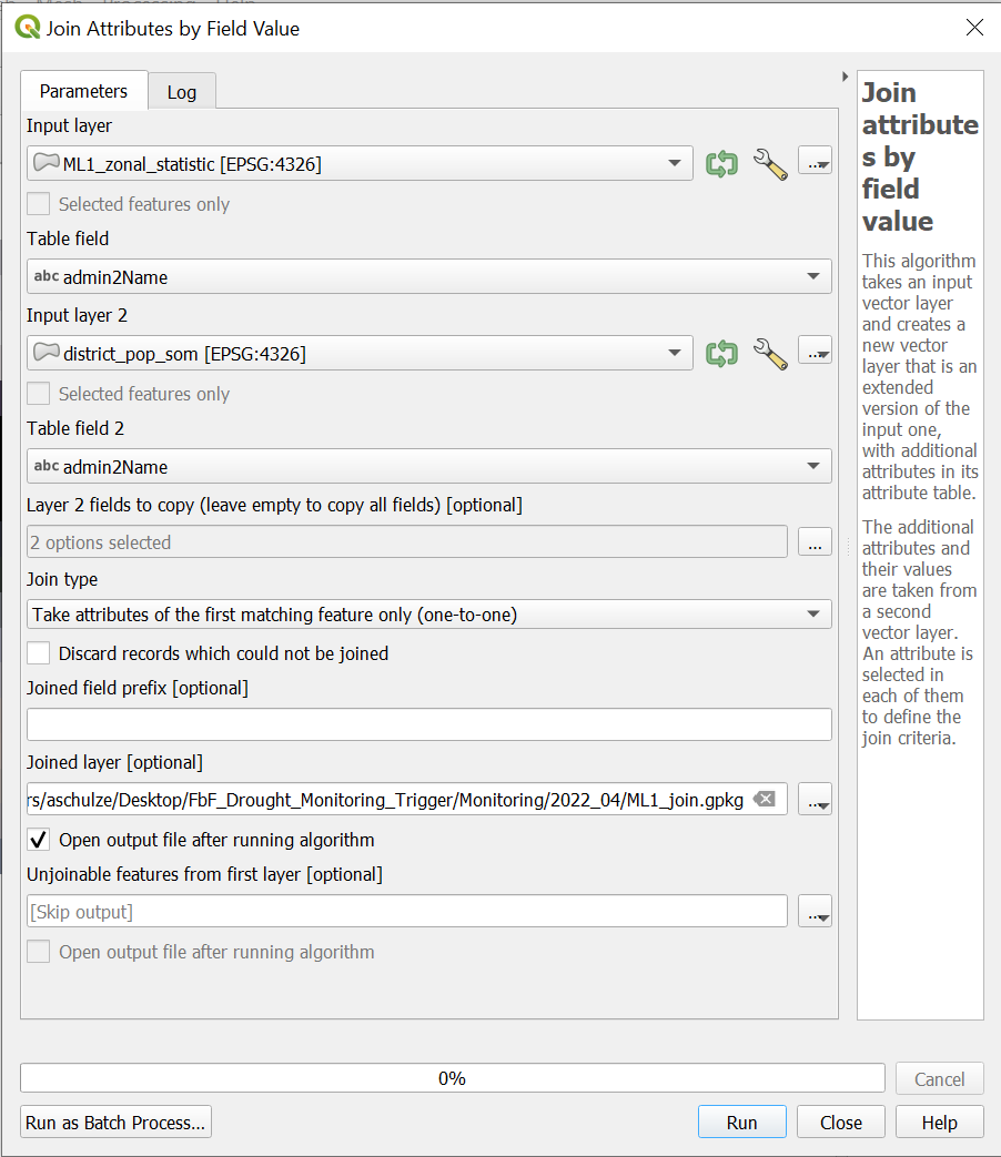 Result: As a result, your two layers “ML1_join_location” and “ML2_join_location” should have the column “Index_per_IPCPolygon_ML1_mean” or “Index_per_IPCPolygon_ML2_mean”. Furthermore, the number of rows should be the exact number of districts in Somalia and the polygons should have the exact shape of the districts.