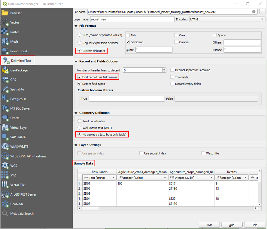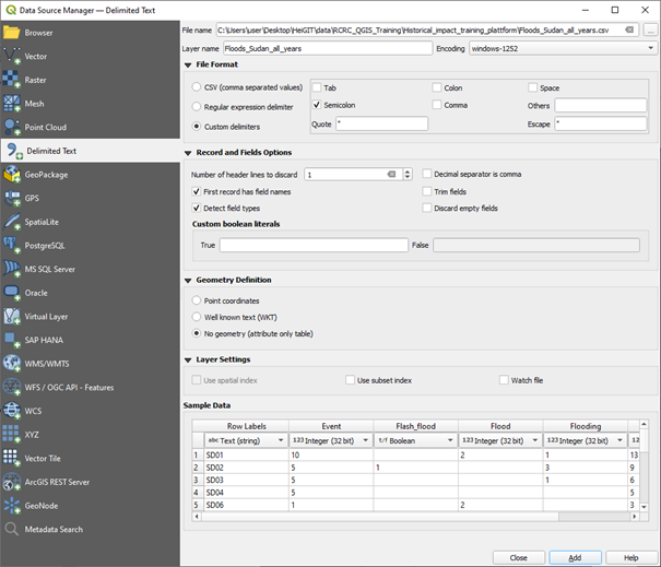 Data Source Managerand select theDelimited Textsection. Here we need to do the following specifications (HIA_import_csv_floods).
