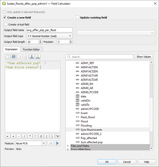 . Here we will calculate the sum of the affected population divided by the number of flood events for each state. Your calculation will look like HIA_field_calculator.
