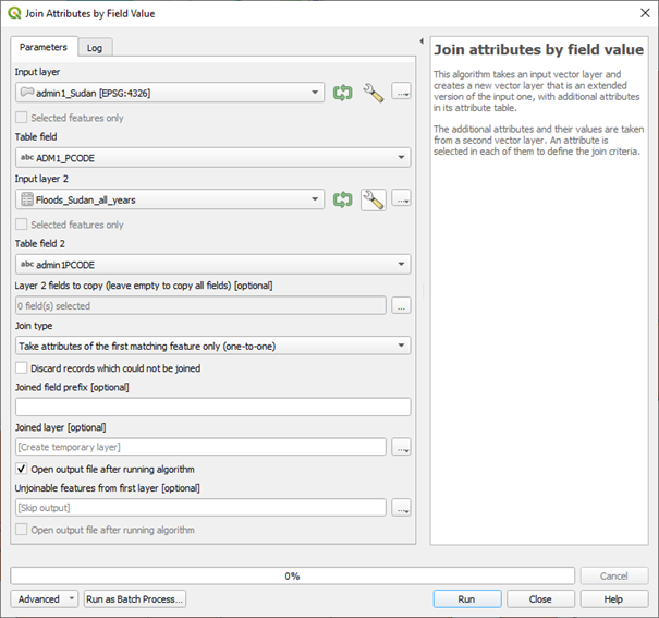 Join attributes by field valuetool and select the ADM1_PCODE as the table field used for the join. An example is shown inHIA_join_floods.