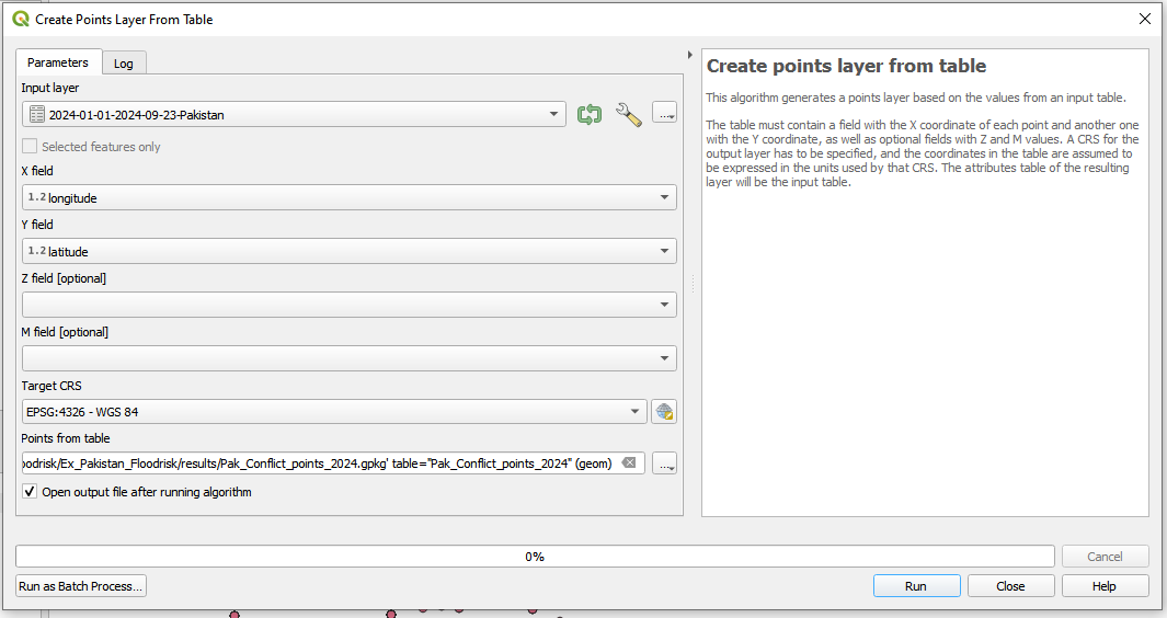 Points from Table, click on the three dots, choose ‘Save to GeoPackage’ and navigate to you temp folder. Save the layer with the name “Pak_Conflict_points_2024”.Click