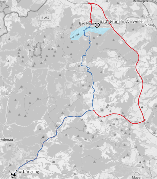 In this second task, we will build upon the knowledge gained from the previous exercise and introduce the concept of avoid areas in route planning using the ORS Tools plugin in QGIS. Your objective is to repeat the workflow of creating a route between the Nürburgring and Bad Neuenahr-Ahrweiler, but this time, you will add specific areas that should be avoided along the route.