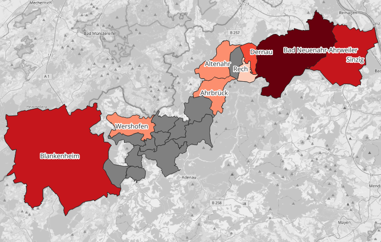 Multiple routes with flood avoidance to different communities in the Ahrvalley#
