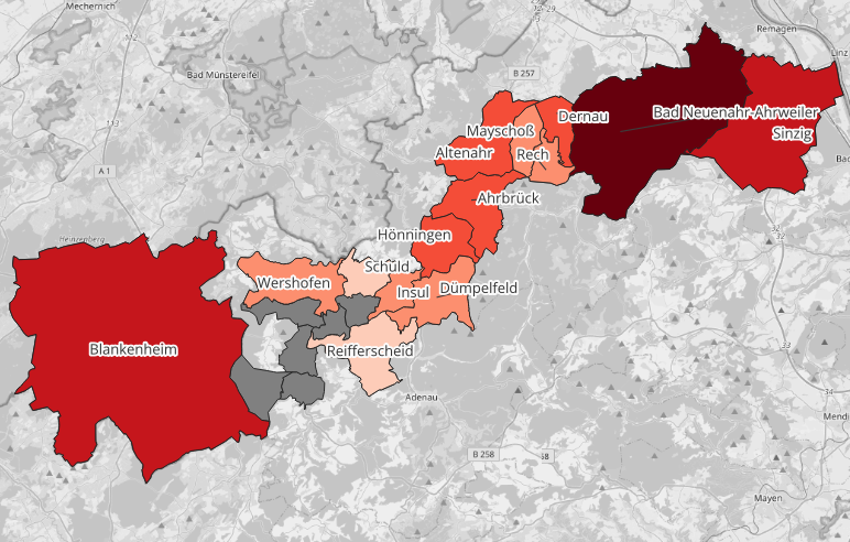 Communities in the Ahrtal valley colored according to the population share within 15min or less travel time to the next healthcare facility.#