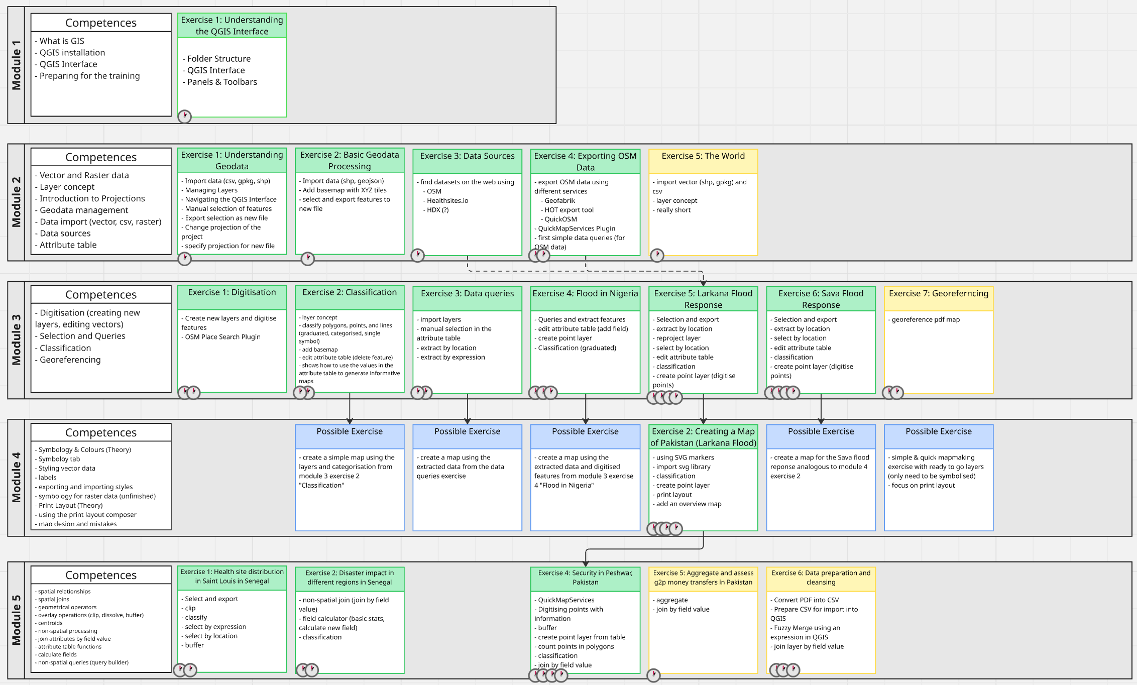 Esta plataforma ofrece varios ejercicios por módulo. Cada módulo cubre las competencias y herramientas que se tratan en él. Los ejercicios varían en complejidad y duración. Tenga en cuenta las competencias que se cubren en cada módulo cuando elija las actividades para el taller. Lo ideal sería cubrir las competencias básicas de cada módulo.