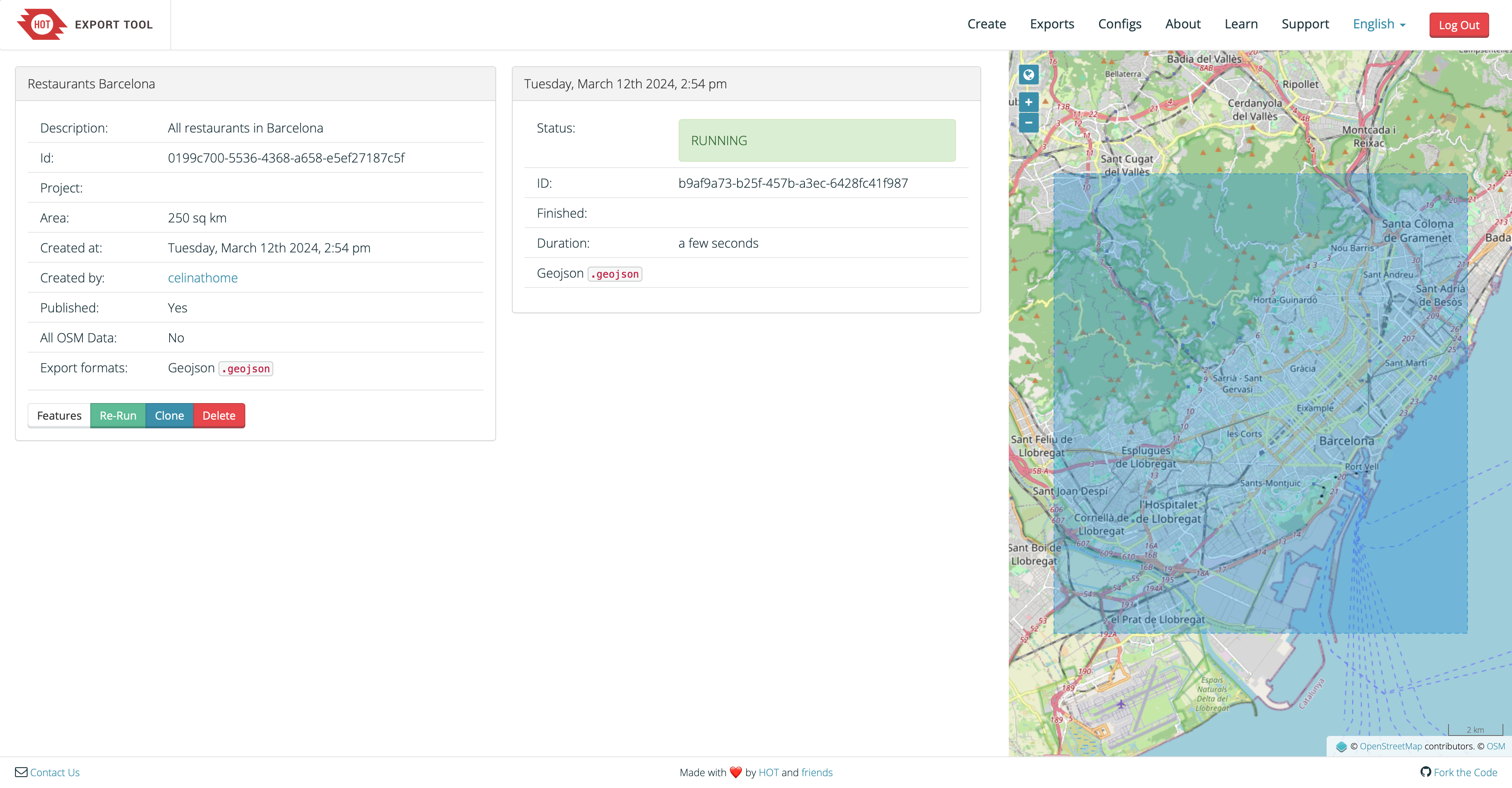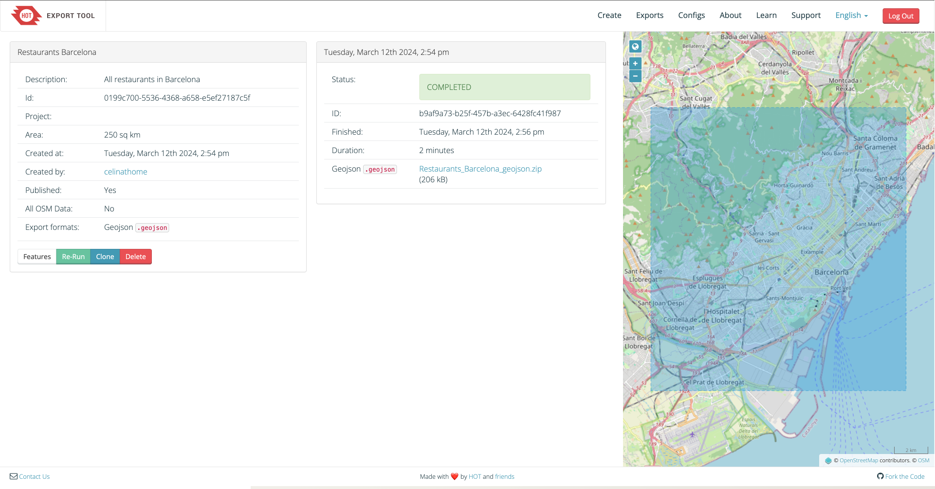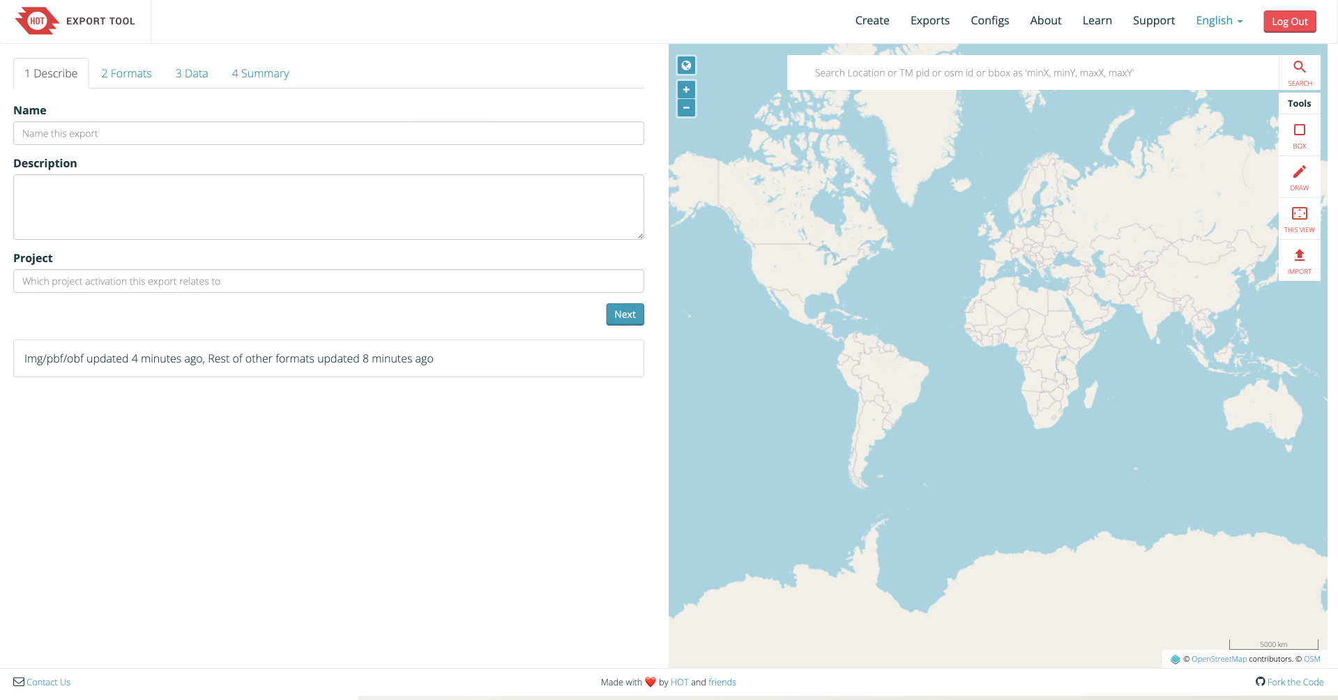 Con la herramienta de exportación del Equipo Humanitario de OpenStreetMap (HOT), puede descargar extractos personalizados de datos actualizados de OSM en distintos formatos de archivo. Ofrece una herramienta basada en navegador para descargar datos de OSM, con buenas opciones para especificar la región, el período, el tipo de entidad y el formato de los datos.