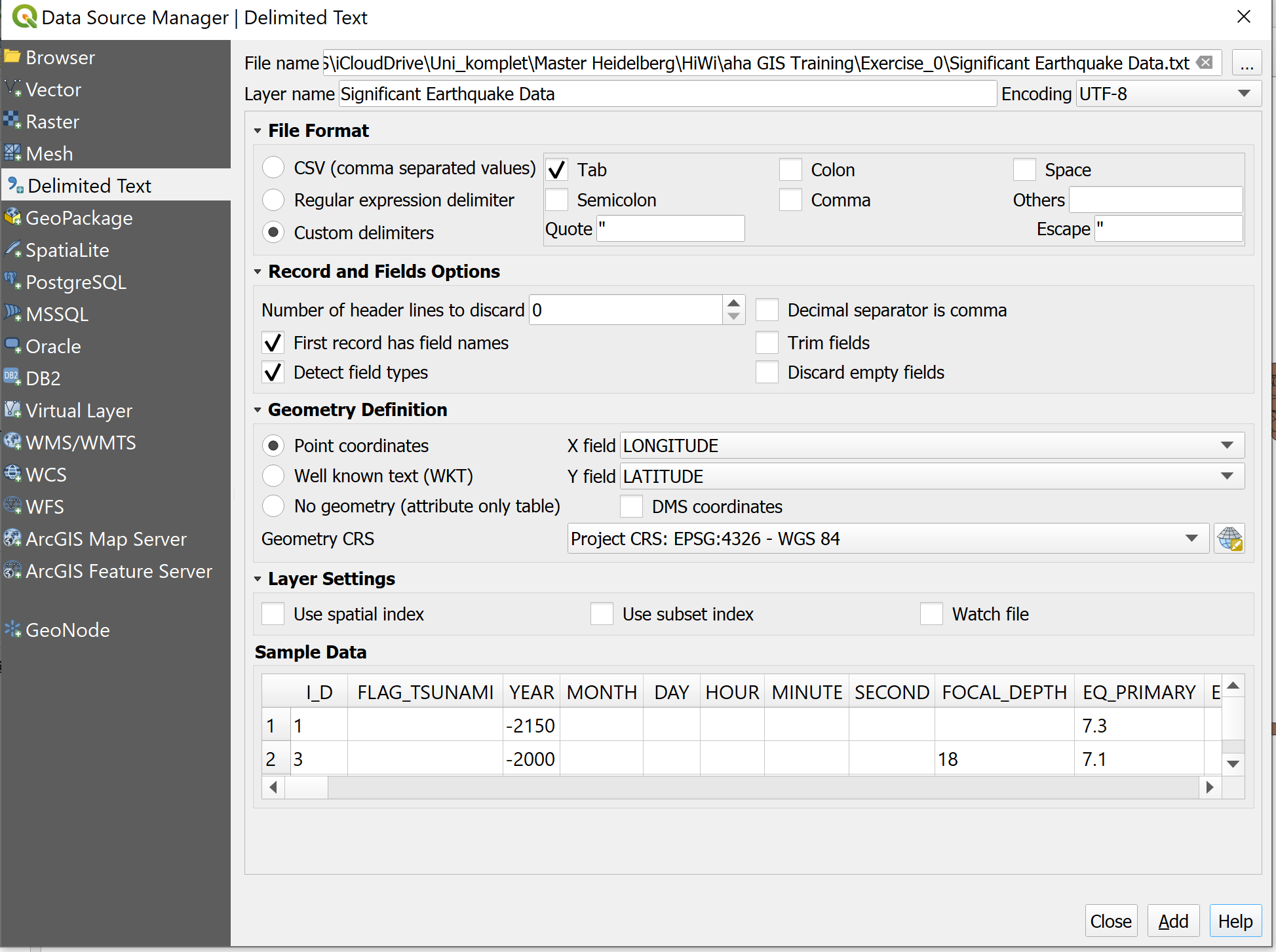 y navegue hasta Significant_earthquake_data.txten ladata/input/-subcarpeta. Seleccione el archivo y haga clic enOpen.En la ventana “Administrador de fuentes de datos| Texto delimitado” en QGIS, abra el menú desplegable