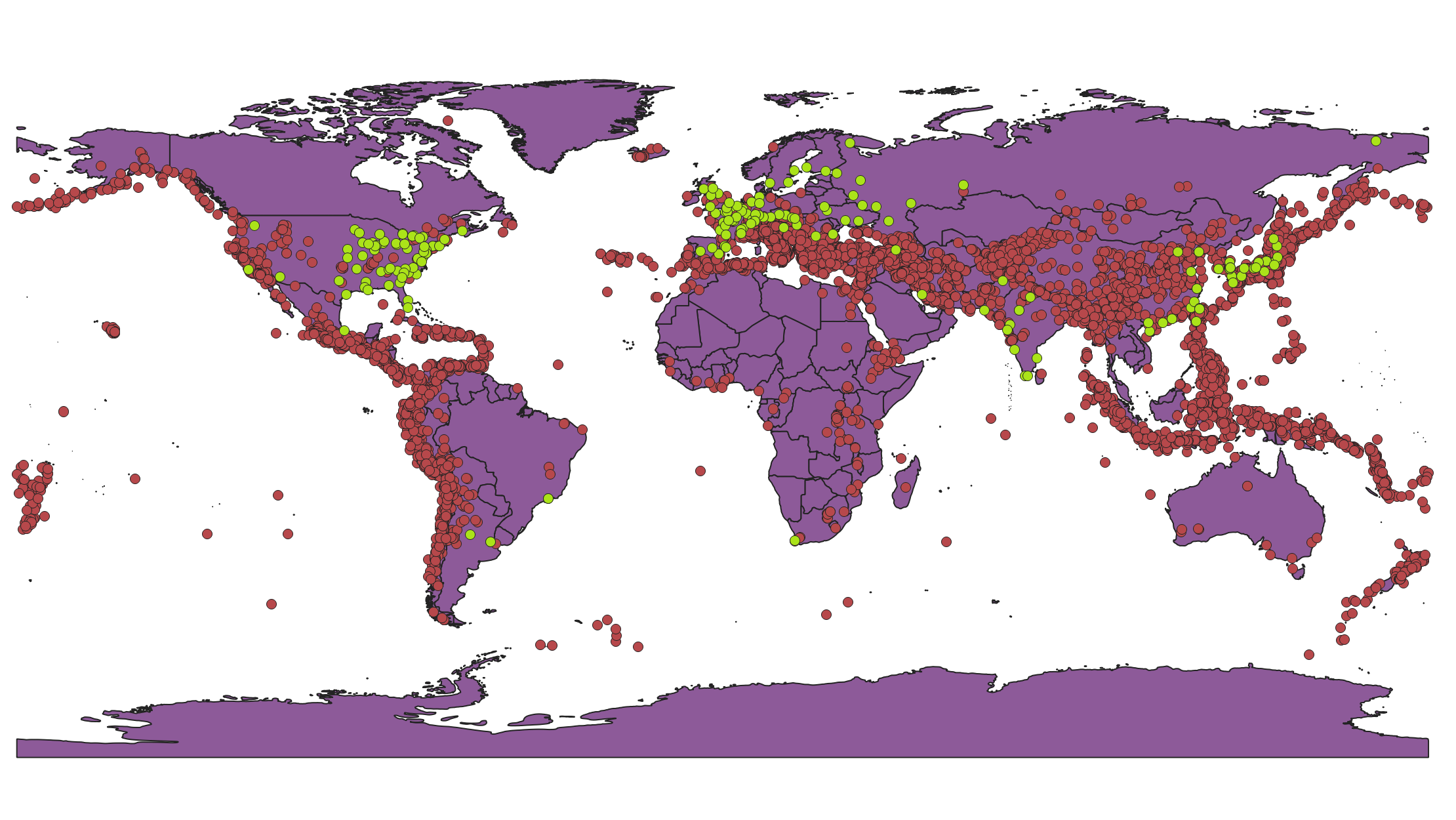 Interactúe con el mapa y explore los conjuntos de datos. Utilice la herramienta de zoom y mueva el mapa. ¿Dónde se pueden encontrar muchos terremotos y dónde se encuentran la mayoría de las centrales eléctricas?