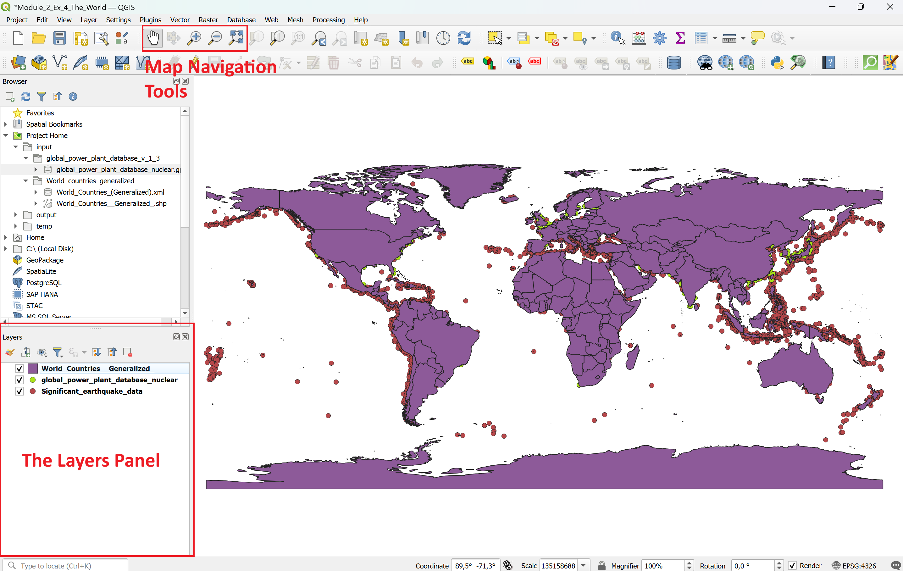 En el panel de capas de la izquierda, organice las tres capas en un orden práctico. Recuerde el Concepto de capa. La capa de países deberá estar situada debajo de las capas de terremotos y centrales eléctricas.