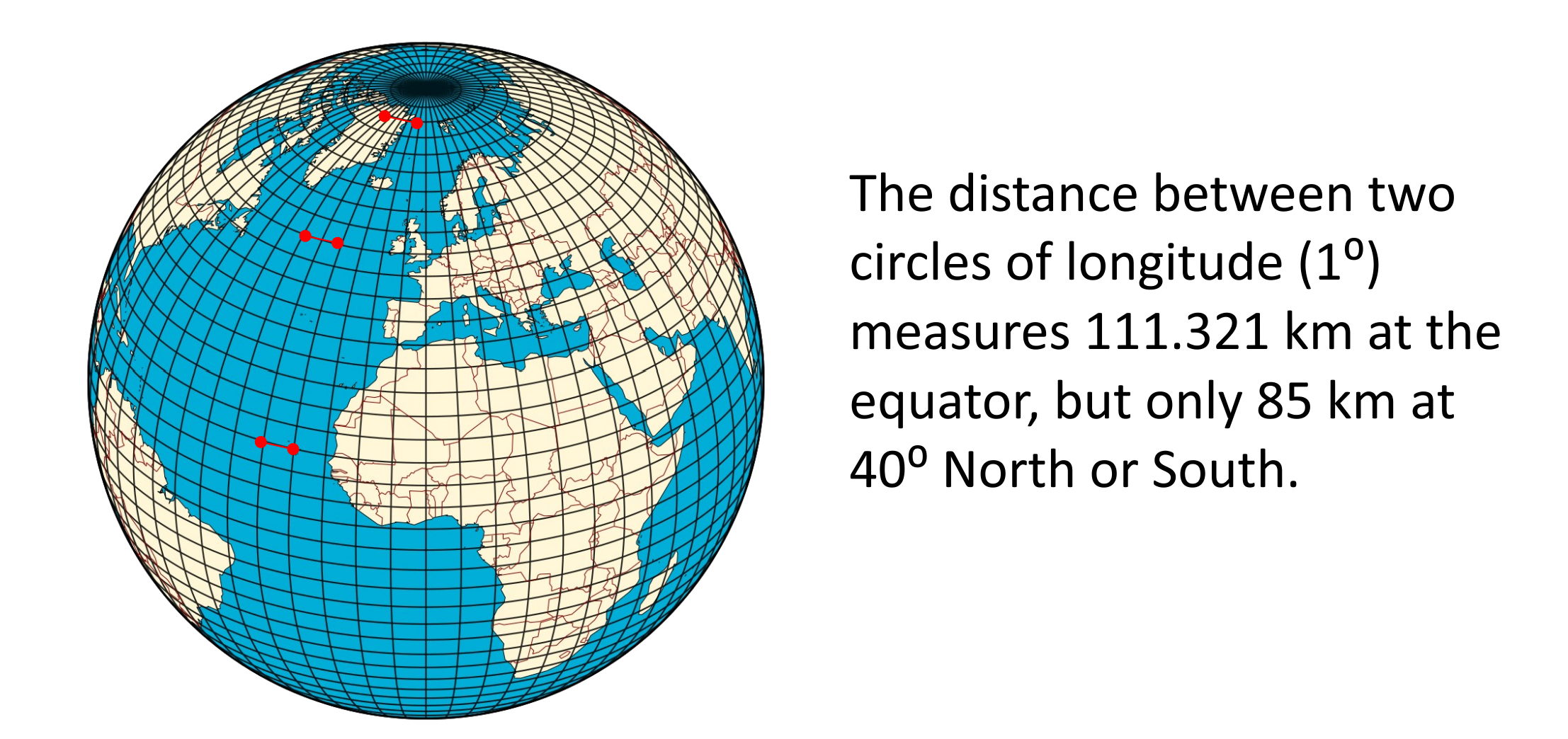Desventajas: Dado que la latitud/longitud son angulares, su conversión a medidas lineales (metros, kilómetros) no es uniforme. Las distancias, áreas y formas pueden estar distorsionadas, especialmente lejos del ecuador. No se pueden medir distancias o áreas euclidianas de forma fiable sin proyectar primero