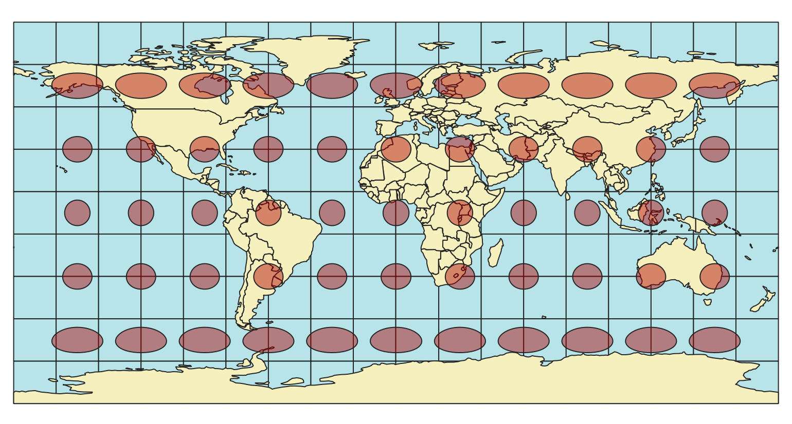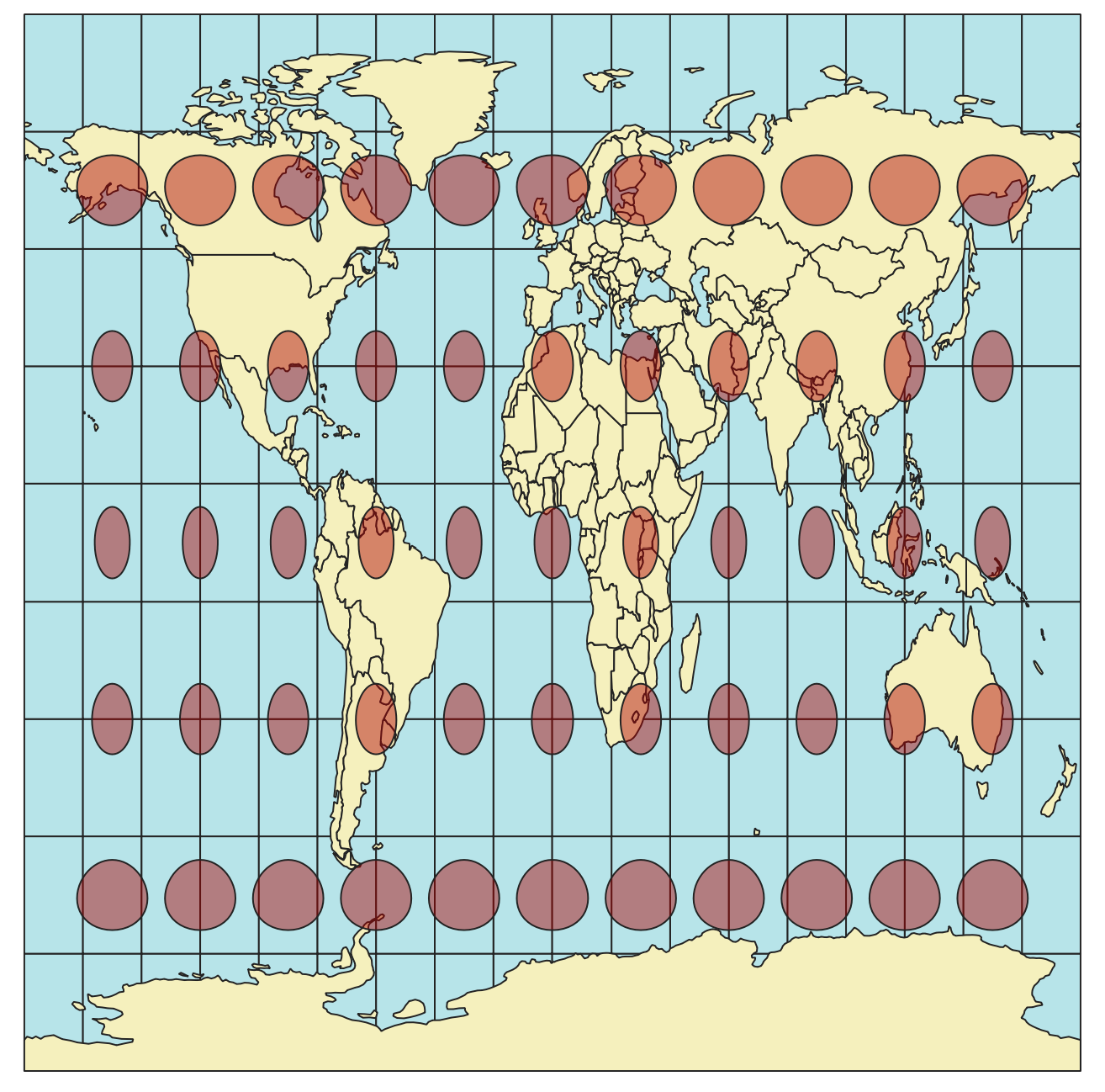 El WGS 84 es un SRC que consiste en un elipsoide que se asemeja mucho a la forma de la Tierra. En lugar de unidades métricas de medida, utiliza grados angulares (latitud y longitud). La forma de los círculos de Tissot no tiene distorsiones cerca del ecuador, pero se alarga en el eje Este-Oeste, cuanto más se aleja del ecuador. A diferencia de la proyección cartográfica de Mercator, no hay distorsión en la dirección Norte-Sur. Como los círculos se distorsionan, podemos deducir que este SRC distorsiona los ángulos.
