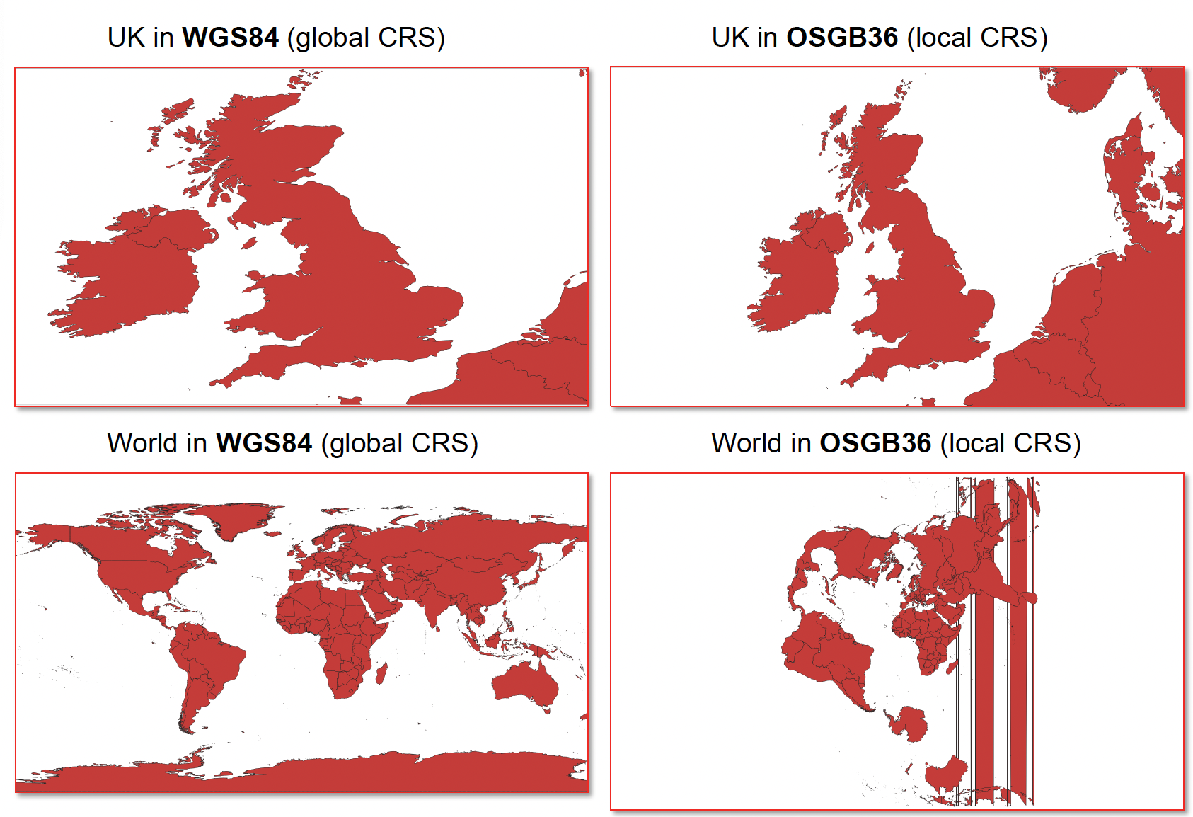 Como puede ver, las regiones más pequeñas aparecen sesgadas y distorsionadas en un SRC global. Para superficies más pequeñas deben utilizarse proyecciones cartográficas locales, ya que ofrecen una visualización más precisa. Sin embargo, las proyecciones cartográficas locales distorsionan mucho el mapa a nivel global.