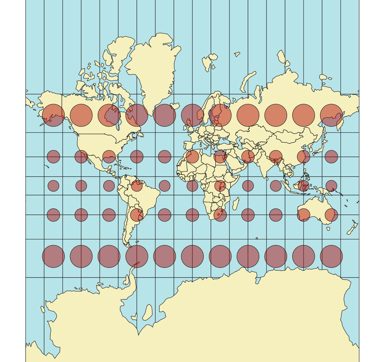 Observe que la forma del círculo no cambia. Fuera de esto, podemos concluir que los ángulos permanecen iguales. Sin embargo, los círculos se hacen más grandes cuanto más se alejan del ecuador, y la distancia entre estos círculos cambia cuanto más se alejan del ecuador. Por lo tanto, podemos concluir que las distancias y los tamaños se distorsionan con la proyección cartográfica de Mercator. El punto fuerte de la proyección cartográfica de Mercator es que conserva los ángulos entre dos líneas. Podemos verlo porque los círculos permanecen perfectamente redondos cuanto más se alejan del ecuador.