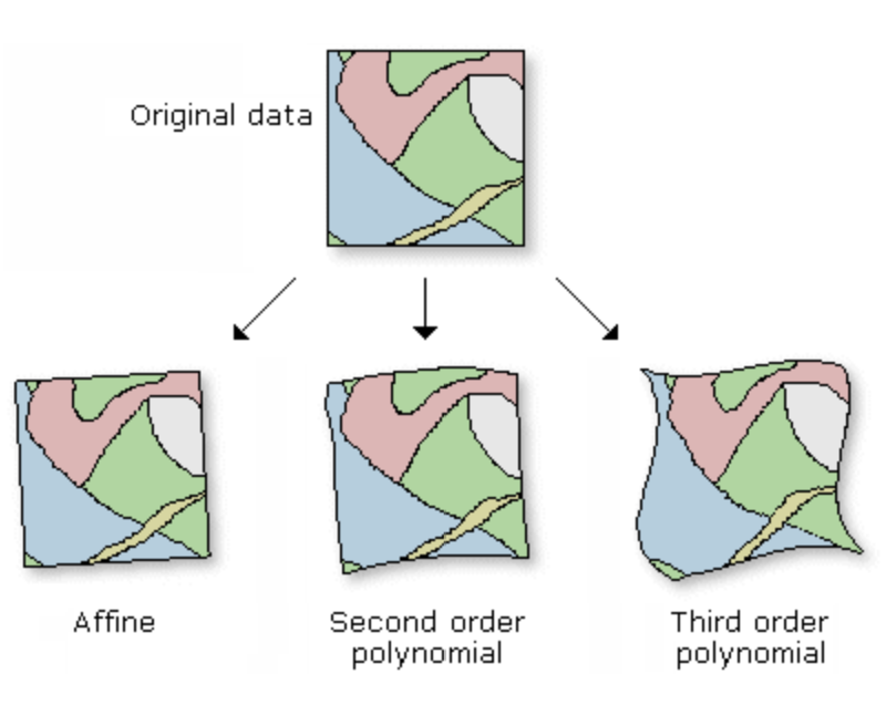 Fig. 3.21 Diferentes tipos de transformación: lineal (izquierda), polinómica de 2.º grado (centro), polinómica de 3.º grado (derecha) (fuente: ESRI).#
