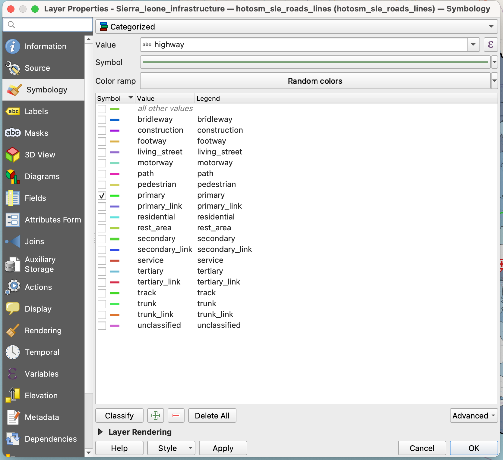 Symbology,Sierra_Leone_roads (Lines)y, al igual que en el paso 9, abra el menú desplegable superior. Ahora, en lugar deGraduated, elija Clasificación por categorías y seleccione “autopista” en el menúValue. Haga clic enClassifypara obtener una clasificación con colores individuales para todos los valores únicos de la columna “carretera”. En las casillas situadas junto a las clases, deseleccione todas las clases excepto “primaria”. Puede cambiar el color de las clases al hacer clic manualmente y ajuste el color en el menú desplegable “Símbolo” que está en la parte superior de la ventana.