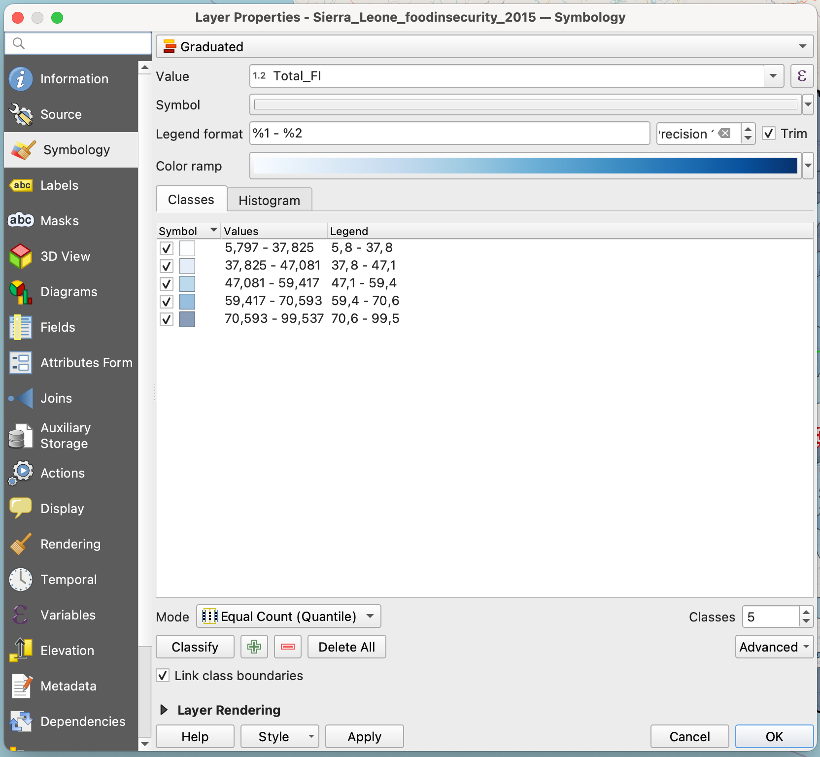 Sierra_leone_foodinsecurity_2015.shpenLayer Panel->Properties. Se abrirá una nueva ventana con una sección de pestañas verticales a la izquierda. Vaya a la pestañaSymbology.En el menú desplegable superior, seleccione