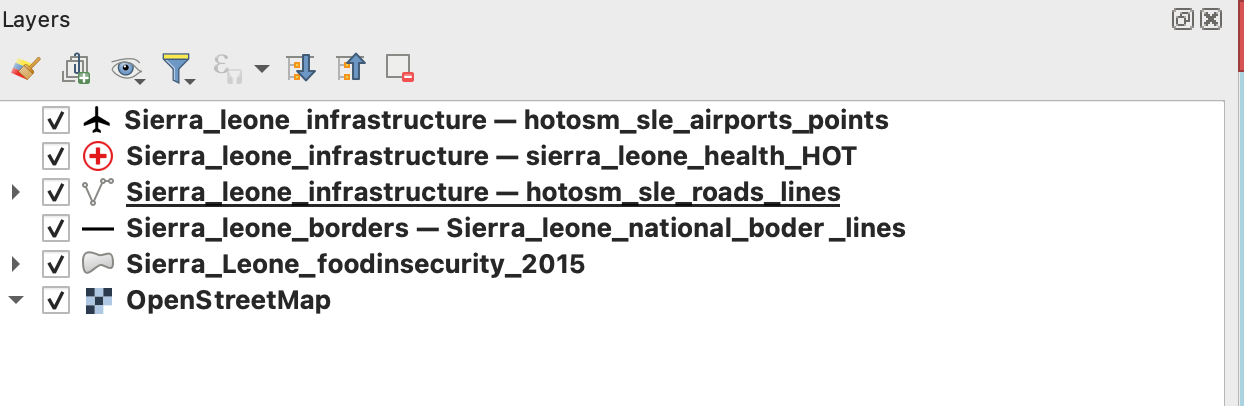 Sierra_leone_roads.gpd(Líneas) GeoPackageSierra_leone_healthsites.gpkg(Puntos) GeoPackagesl_airports.gpkg(Puntos) GeoPackage