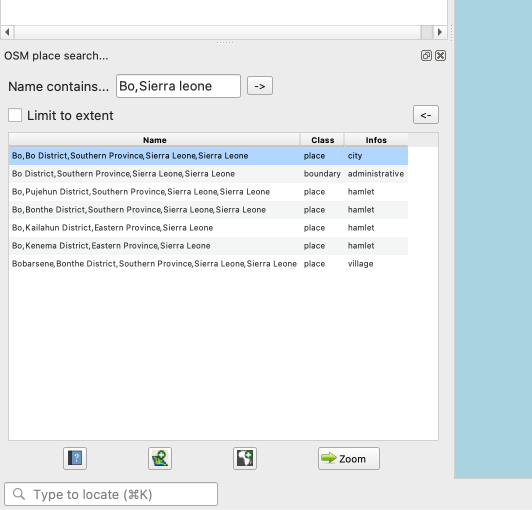 OSM Place Search. Para agregar el complementoOSM Place Search, haga clic enPlugins->Manage and Install Plugins…->Ally busque “OSM Place Search”. Una vez que lo haya encontrado, haga clic en este y seleccionarInstall Plugin. Puede abrirOSM Place Search Panelcomo cualquier otro panel, haciendo clic enView->Panelsy marcandoOSM Place Search Panel(video en Wiki).En el panel, puede buscar lugares en OpenStreetMap escribiendo el nombre en la barra de búsqueda. A menudo tiene sentido añadir información adicional, como el nombre del país. Pruebe, por ejemplo, con “Bo, Sierra Leona”.