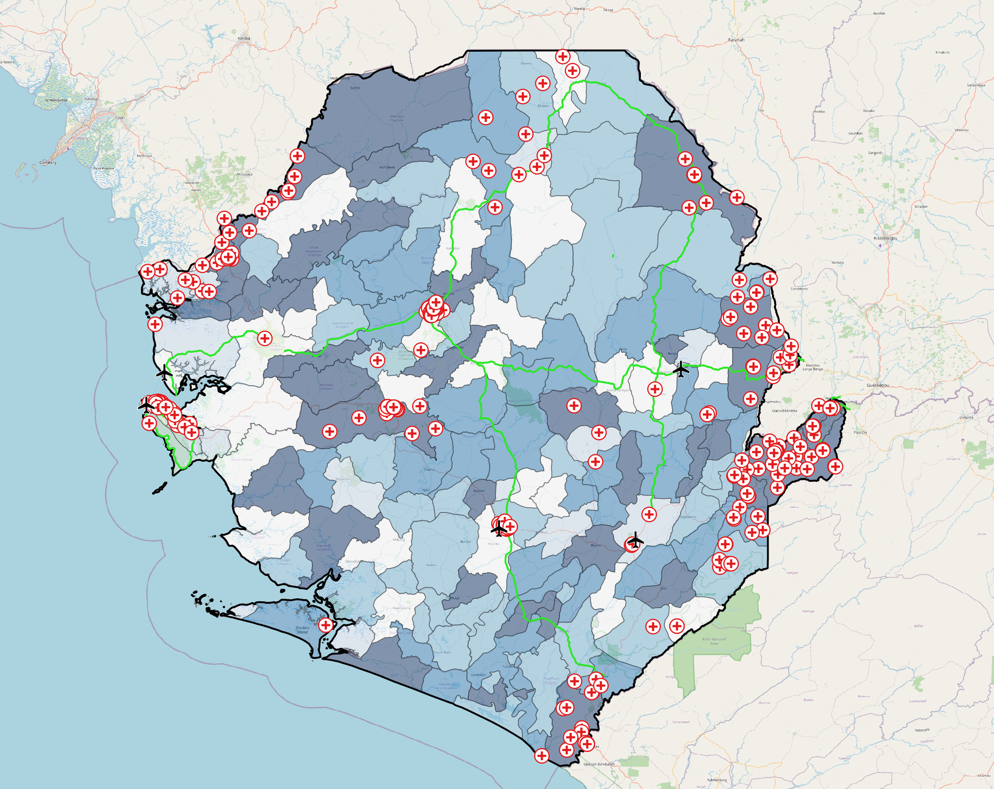 Sierra_Leone_healthSierra_Leone_airportsSierra_Leone_roadsSierra_Leone_national_bordersSierra_leone_foodinsecurity_2015Mapa base: