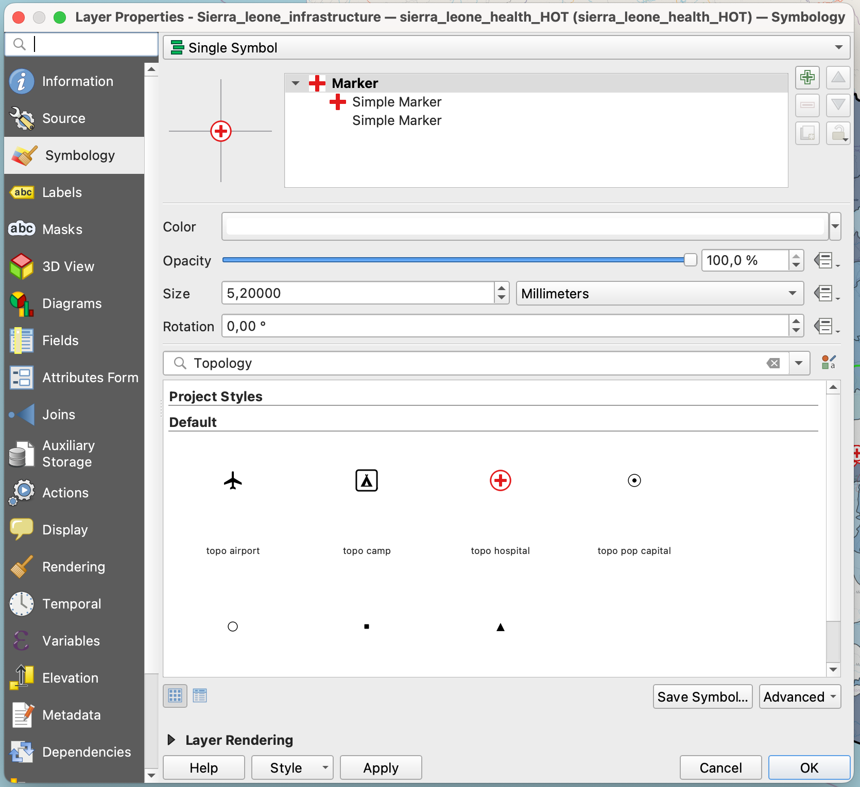 Symbologypara las capas respectivas y elegir “Topología” en el menú desplegable situado encima del panel superior del panel inferior. Busque el símbolo del aeropuerto/hospital y selecciónelo al hacer clic en este. Una vez más, aplique los cambios al hacer clic enApplyyOK.