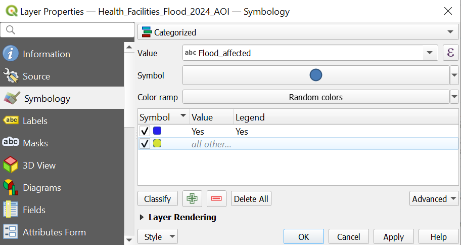 Classify. Ahora debería ver todos los valores únicos o atributos de la columna “Flood_affected” seleccionada. Puede ajustar los colores haciendo doble clic en cada color del campo central. Una vez que haya terminado, haga clic enApplyyOKpara cerrar la ventana de simbología.