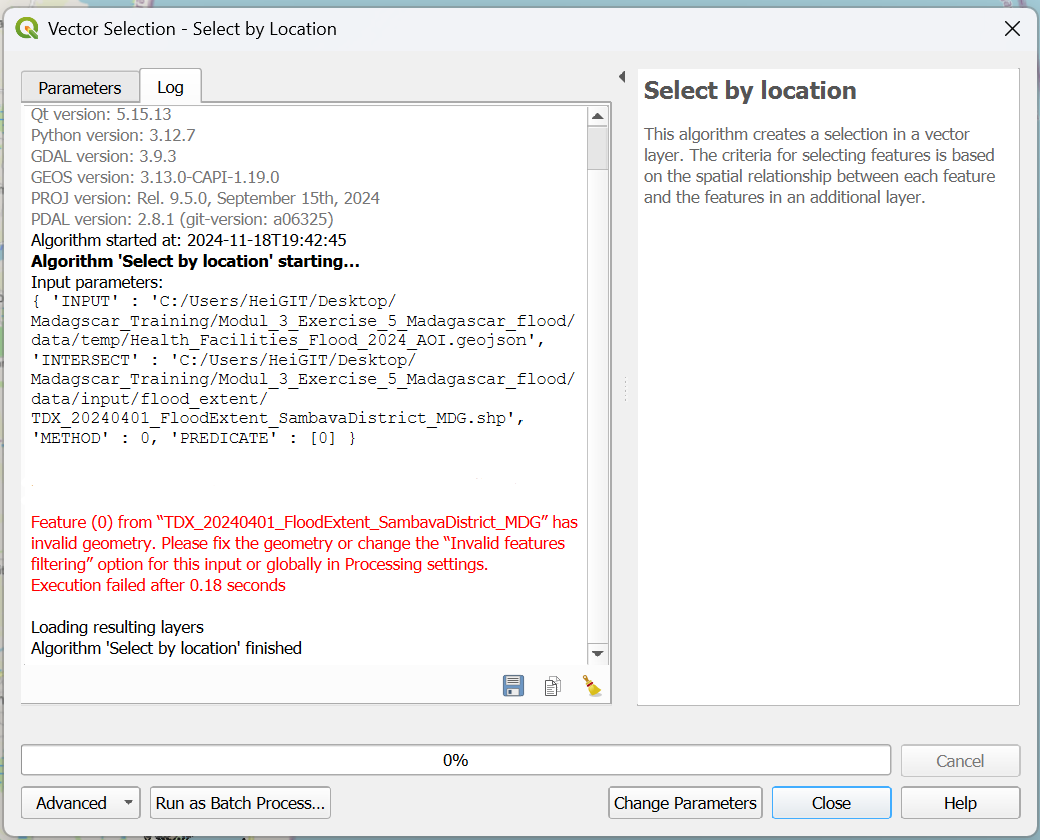 La entidad (1) de “TDX_20240401_FloodExtent_SambavaDistrict_MDG” tiene una geometría no válida. Corrija la geometría o cambie la configuración de Procesamiento a la opción “Ignorar entidades de entrada no válidas”. Falló la ejecución después de 0,07 segundos