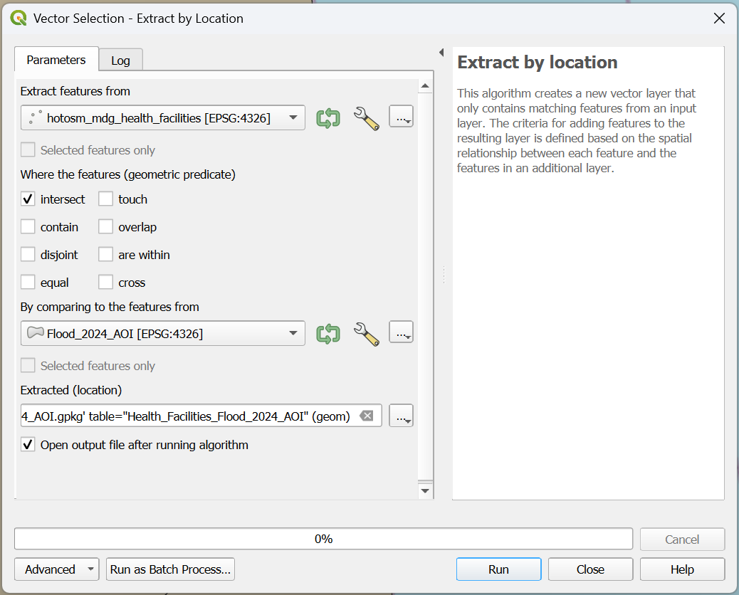 Extract (location)->Save to GeoPackagey vaya a la carpetatemp. Guarde la nueva capa con el nombre “Health_Facilities_Flood_2024_AOI”. Dé a la nueva capa el mismoLayer namey haga clic enRun.