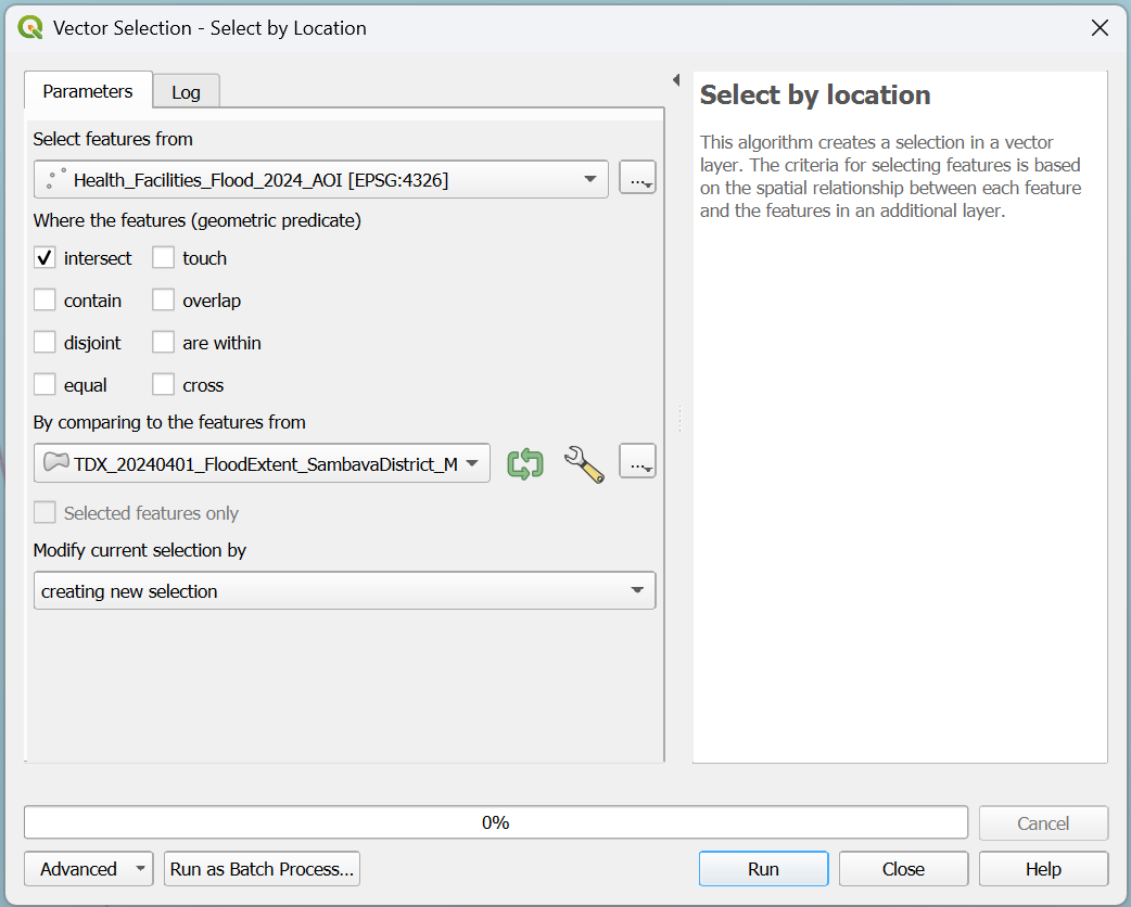 By comparing to the features fromutilizamos la capa “TDX_20240401_FloodExtent_SambavaDistrict_MDG”.Modify current selection by=creating new selection.Haga clic en
