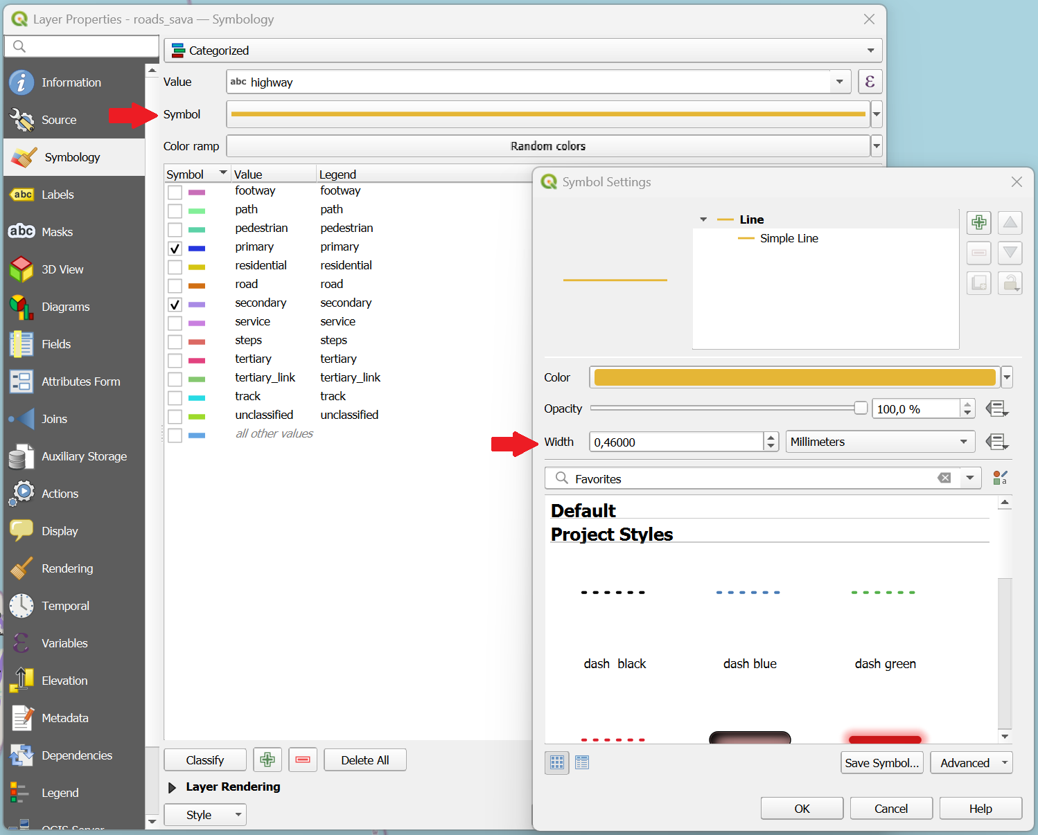 Tiene la opción de personalizar el ancho de las líneas de las carreteras principales para mejorar la visualización. Abra la ventana de simbología y seleccione