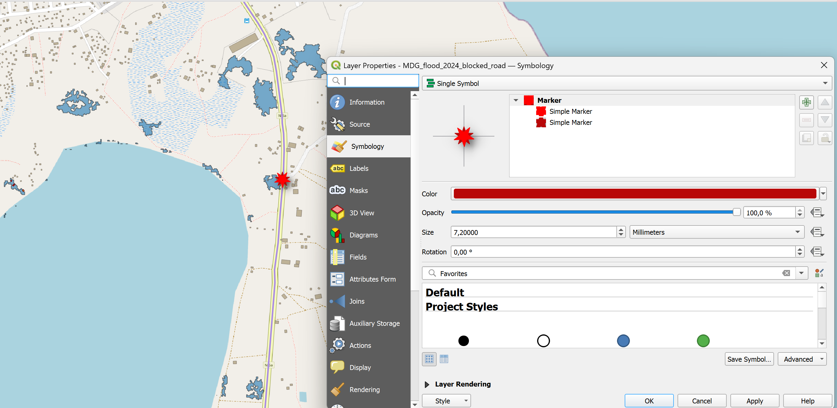 Ahora, hemos mapeado todas las carreteras de nuestra AOI que están bloqueadas por la inundación. Podemos utilizar iconos en lugar de solo puntos para mostrar la capa “MDG_flood_2024_blocked_road” para visualizar mejor este hecho wiki.
