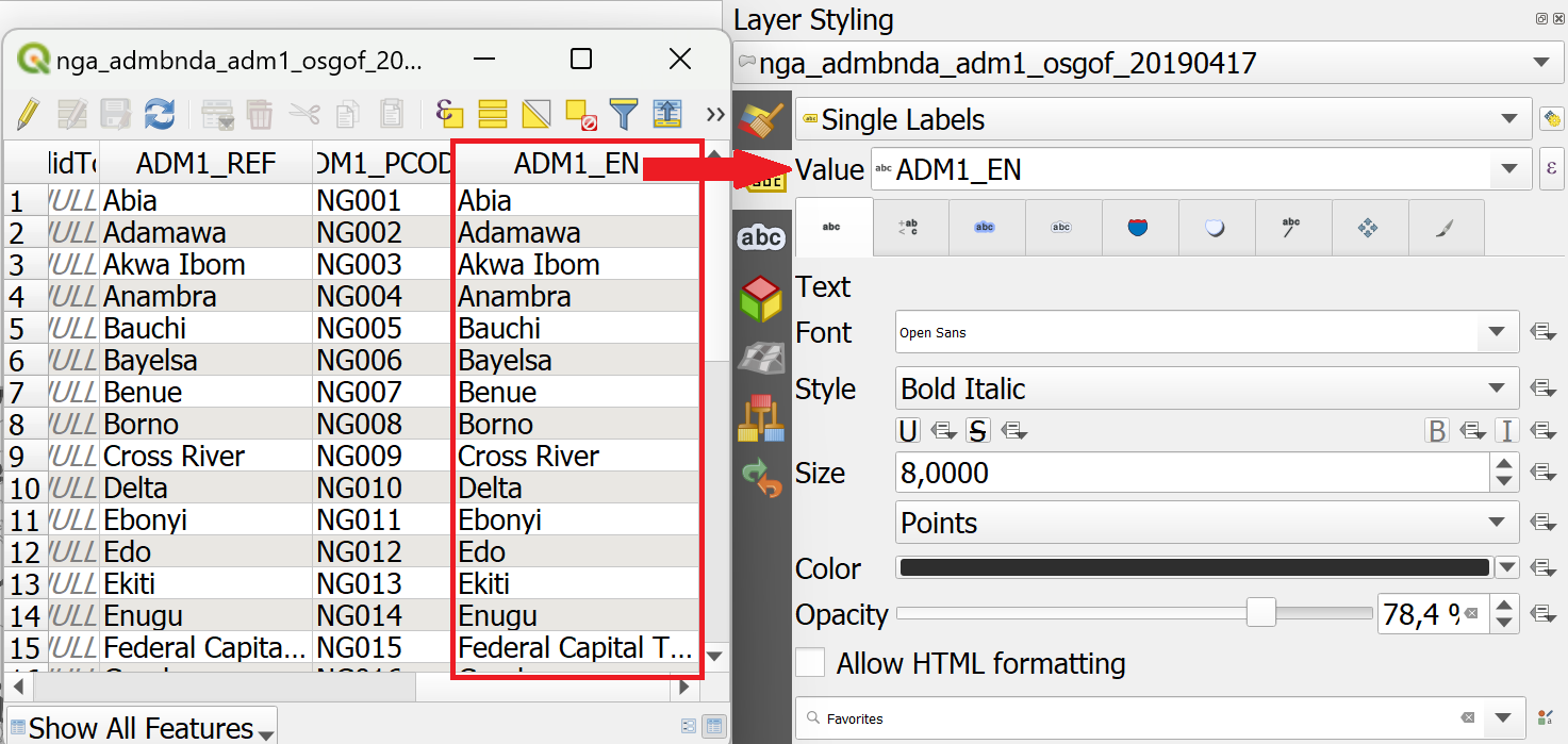 Single labels.Valuees donde se elige el atributo que se mostrará como etiqueta. Por ejemplo,*ADM1_EN*mostrará los nombres en inglés de los estados nigerianos para cada entidad del conjunto de datos.Cambiemos la fuente: Abra el menú desplegable de fuentes y seleccione Arial. Cree el texto
