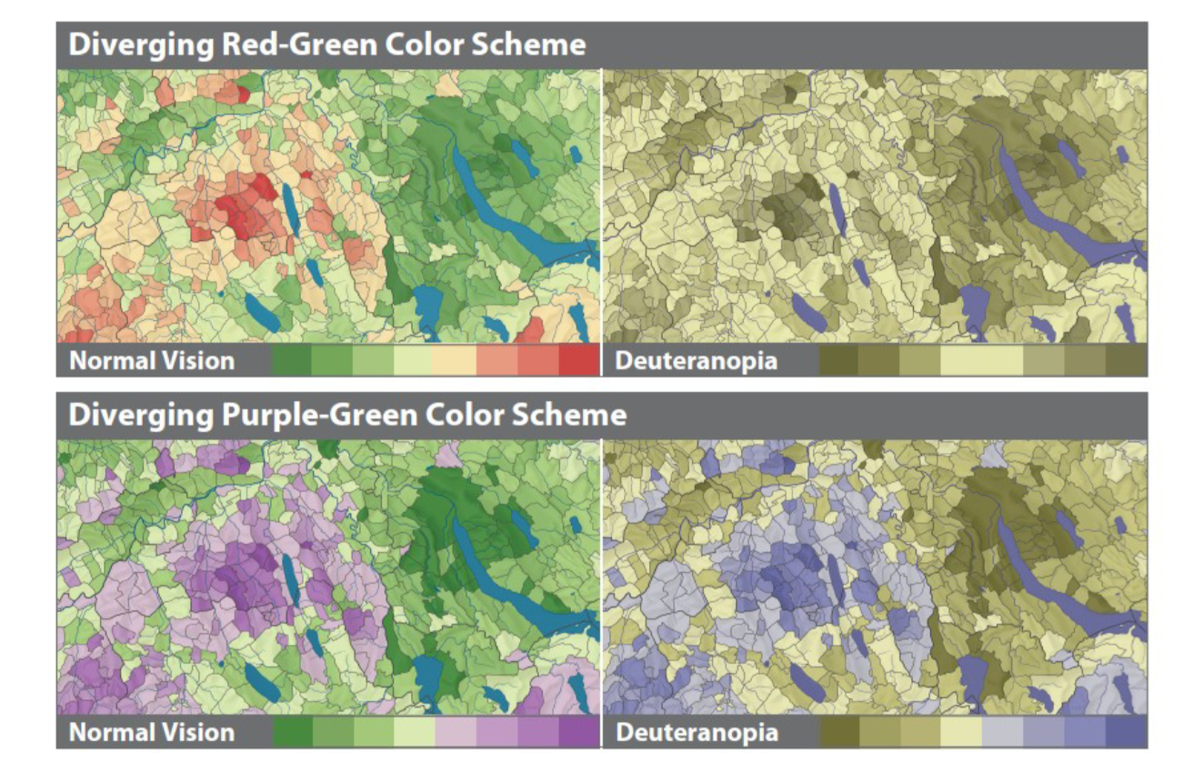 Fig. 4.15 Diferentes esquemas de colores para las personas con problemas de visión cromática (fuente: Jenny, Bernhard, y Nathaniel Vaughn Kelso. (2007). Color Design for the Color Vision Impaired. Cartographic Perspectives, núm. 58 (1 de septiembre de 2007): 61-67. https://doi.org/10.14714/CP58.270).#