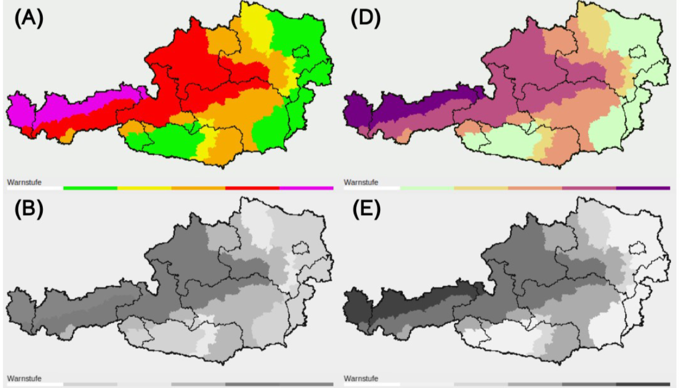 Fig. 4.13 Ejemplos de diferentes gradientes de color traducidos a blanco y negro. Preste atención al degradado de saturación debajo de cada ejemplo. (Fuente: Stauffer, Reto y Mayr, Georg y Dabernig, Markus y Zeileis, Achim. (2014). Somewhere Over the Rainbow: How to Make Effective Use of Colours in Meteorological Visualizations. Bulletin of the American Meteorological Society. 96. 140710055335002. 10.1175/BAMS-D-13-00155.1.)#