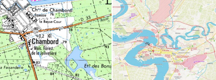 A partir de estas variables visuales, los cartógrafos son capaces de interpretar y comunicar información crucial para las operaciones humanitarias. Según el caso práctico y los destinatarios, se utilizarán diferentes estilos para comunicar diferentes datos. OpenStreetMap ofrece varios productos cartográficos: OSM Standard, Tracestack Topo, CyclOSM o el mapa de transporte público, por ejemplo. Los datos que sustentan los mapas son los mismos, pero el estilo es diferente. En cada caso, los cartógrafos tenían diferentes objetivos en mente (por ejemplo, para el mapa ciclista, mostrar las rutas ciclistas más seguras, las estaciones de reparación de bicicletas y los lugares de descanso) y eligieron el estilo en consecuencia.