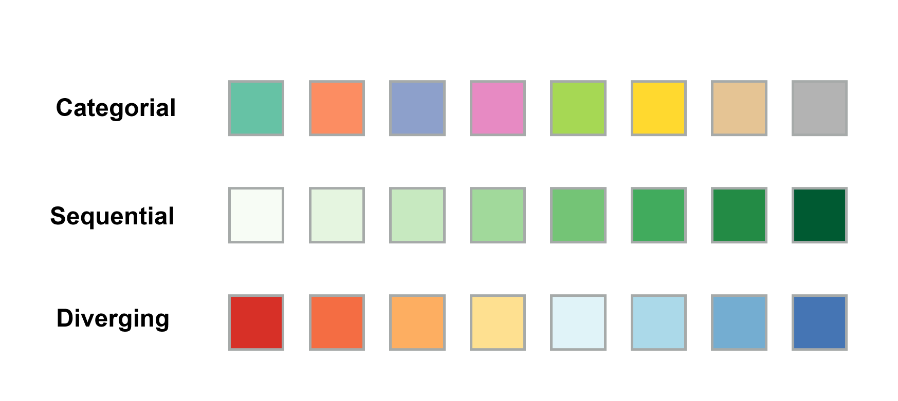 ¿Cuál es la diferencia entre esquemas de colores categóricos (cualitativos), secuenciales y divergentes? ¿Cuándo es apropiado cada uno?
