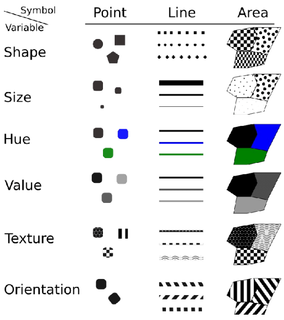 Las variables visuales son propiedades gráficas de los símbolos cartográficos (puntos, líneas, polígonos) que pueden variarse para codificar información (por ejemplo, tono, valor, tamaño, forma, orientación, textura).