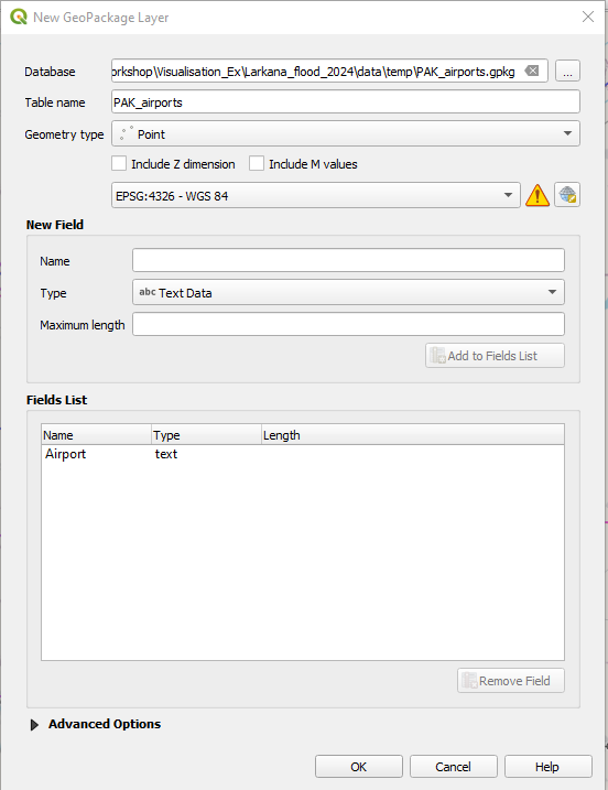 y navegue a la carpeta temp. Asigne un nombre para el nuevo conjunto de datos “PAK_airports”. Haga clic enSave.Geometry type: SeleccionePointEn
