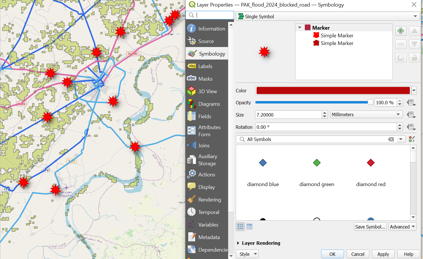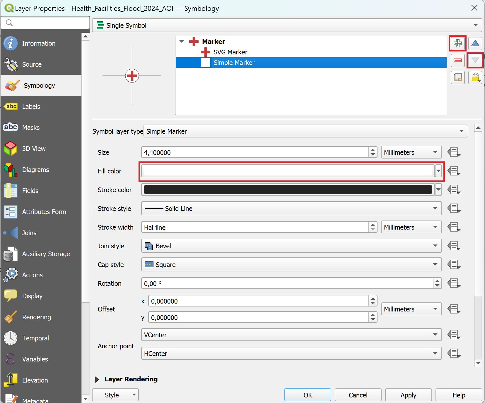 En el panel de capas, haga clic con el botón derecho en la capa Health_Facilities_Flood_2024_AOI > Properties. Se abrirá una nueva ventana con una sección de pestañas vertical a la izquierda. Vaya a la pestaña Symbology.
