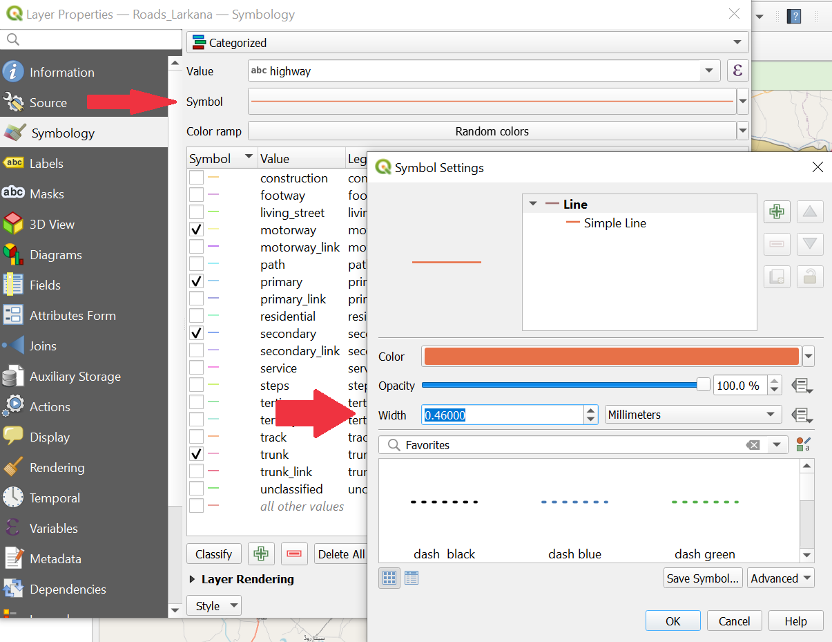 Podemos clasificar las carreteras y luego seleccionar aquellas pertinentes, que se mostrarán. Para categorizar las carreteras, haga doble clic en la capa Roads_Larkana. La ventana de propiedades se abrirá con una barra de pestañas vertical a la izquierda. Vaya a la Symbology tab.