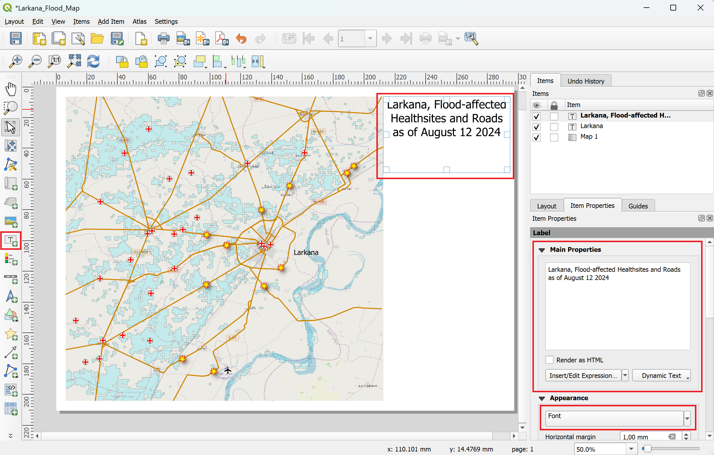 En la ventana de propiedades del elemento, a la derecha, encontrará un cuadro de texto con el texto “Lorem ipsum”. Aquí puede introducir el título de su mapa (p. ej.: “Larkana, centros de salud y carreteras afectadas por inundaciones”).